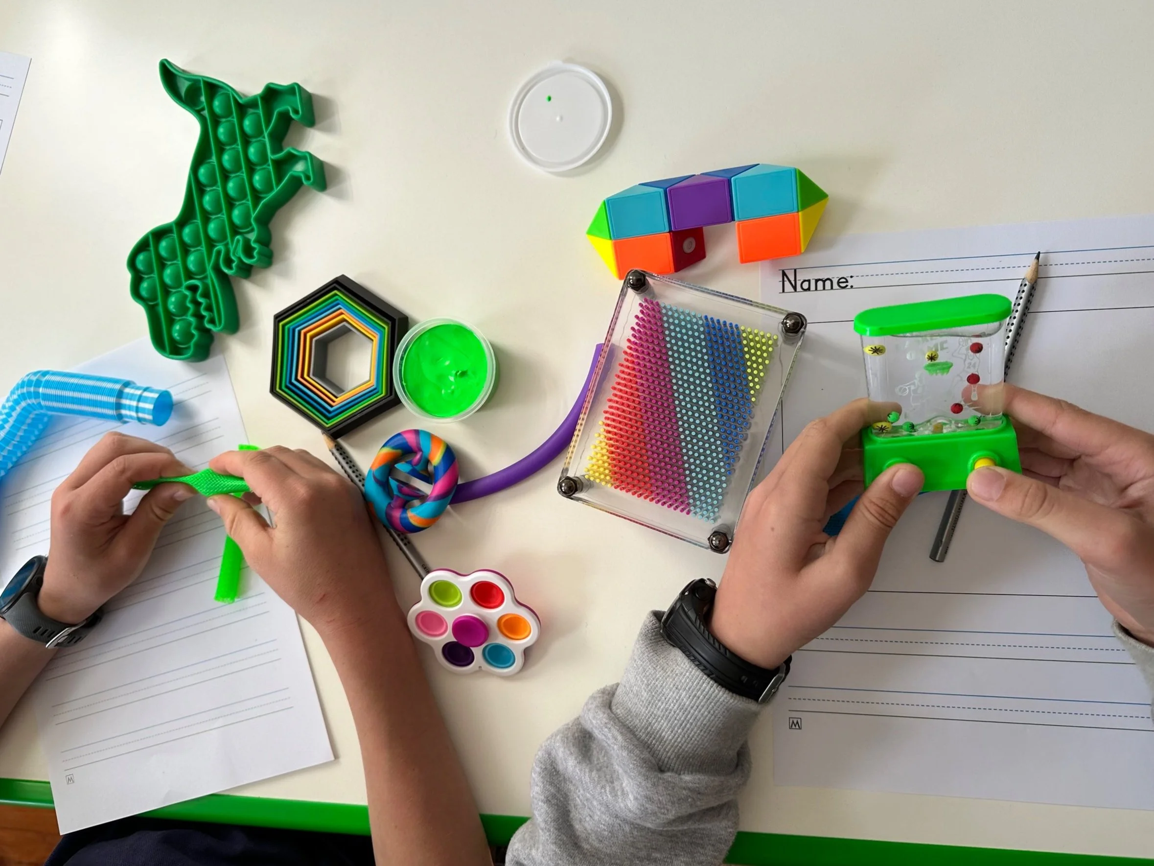 Students with sensory processing issues often need a way to regulate their nervous system. Fidgets offer a variety of sensory inputs including proprioception, tactile, visual, and vestibular, which can help calm and organise the brain. If an occupational therapist has identified that additional sensory input will assist in regulating your child, they can assist in identifying which type of fidgets will be beneficial.